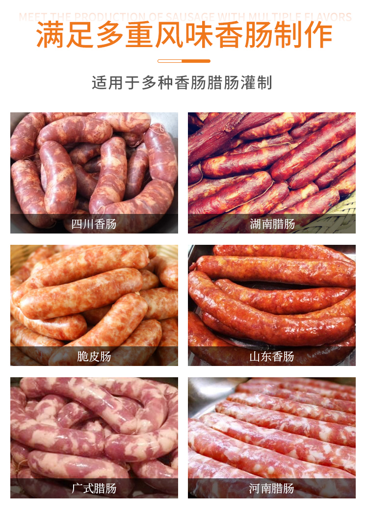 適用于四川香腸、湖南臘腸、脆皮腸、山東香腸、廣式臘腸、河南臘腸等生產加工