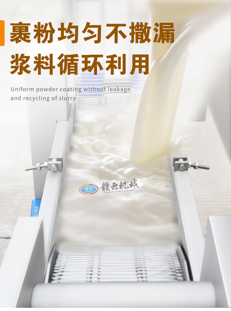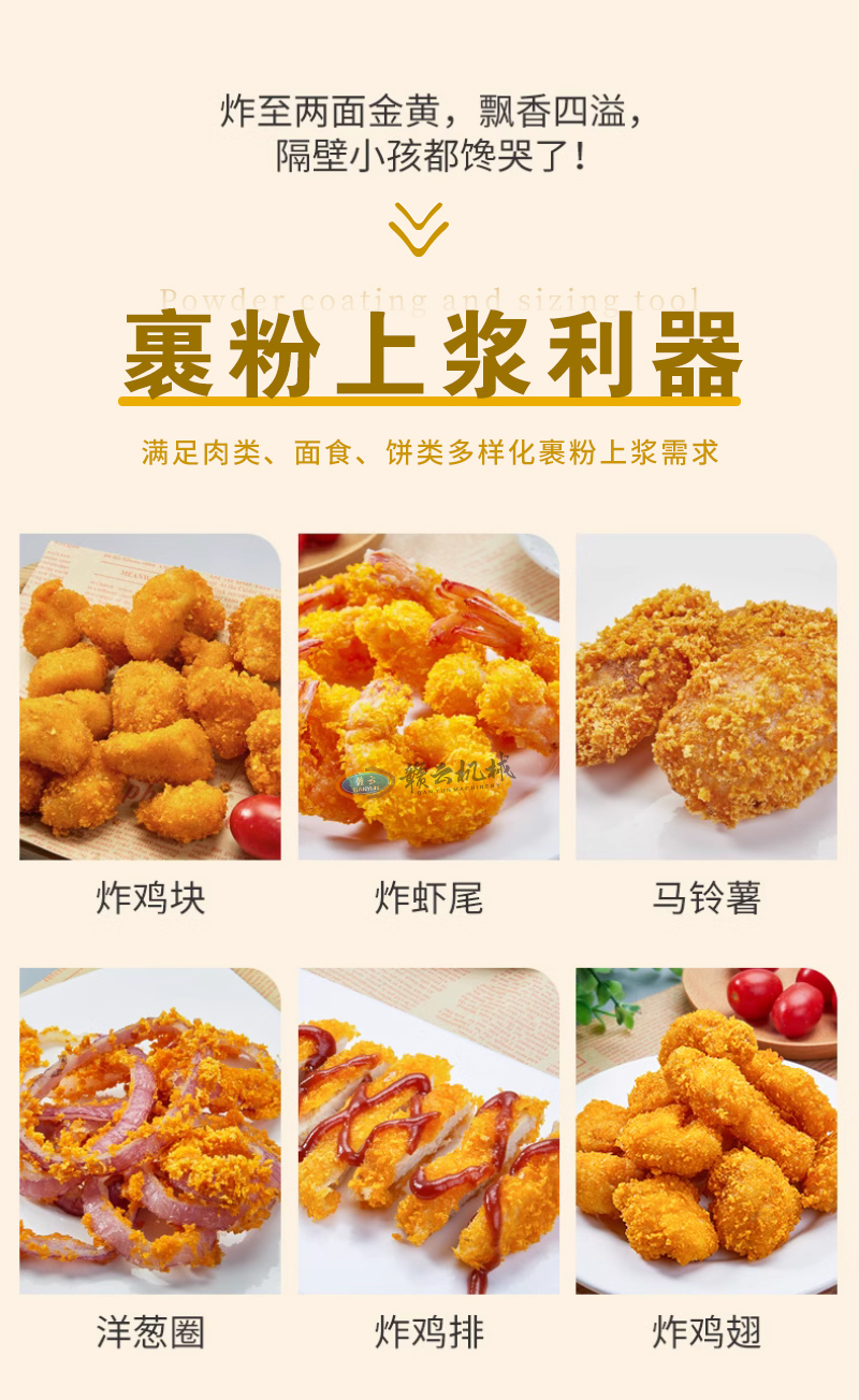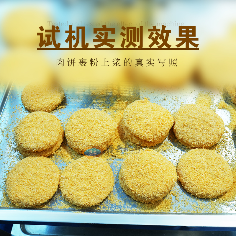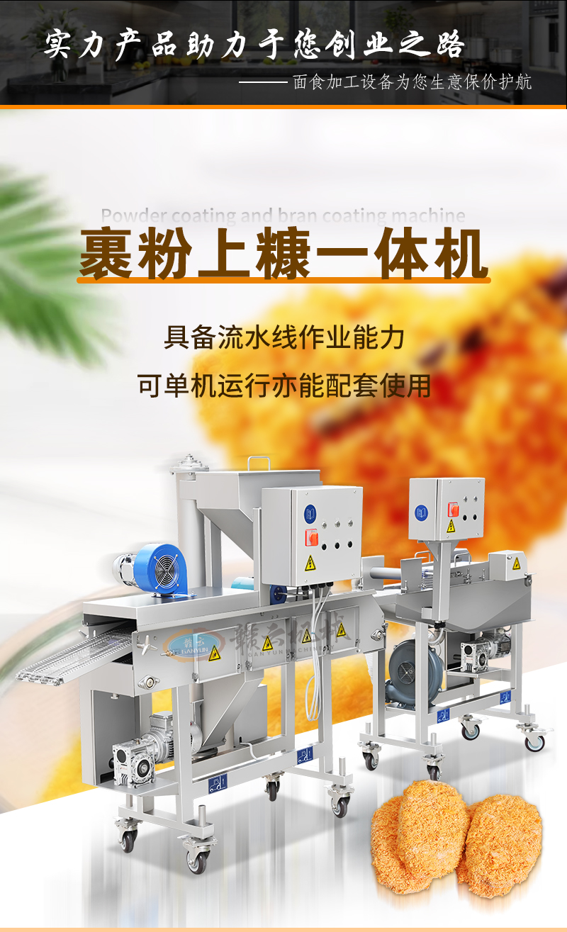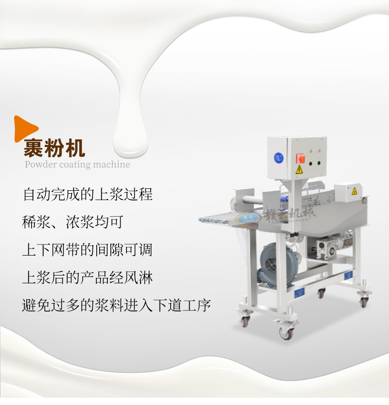 用于雞排、肉餅、魚排、牛排等各種油炸食品的快速自動上漿裹粉。