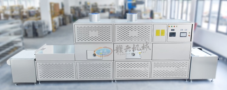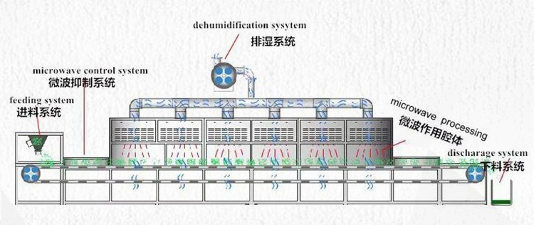 2.微波烘干區域:烘干區域是一個位于隧道中間區域,待烘干的物體通過輸送帶進烘干室內進行快速烘干。烘干室通常排濕系統和輸送系統,周邊由金屬材料構成,以防止微波輻射泄露出去。