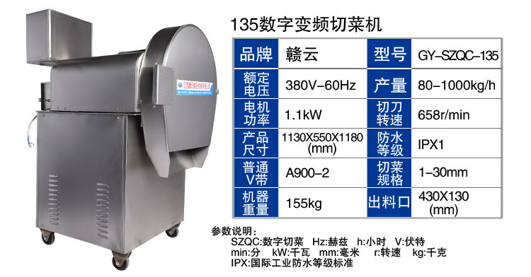 贛云機械生產的135型數字變頻切菜機適用于莖葉類軟菜(芹菜、韭菜、軟豆,菠菜,綠葉蔬菜如莖段),和細長的硬蔬菜(黃瓜,胡蘿卜,等)是制作面食加工行業的理想設備餐飲業.