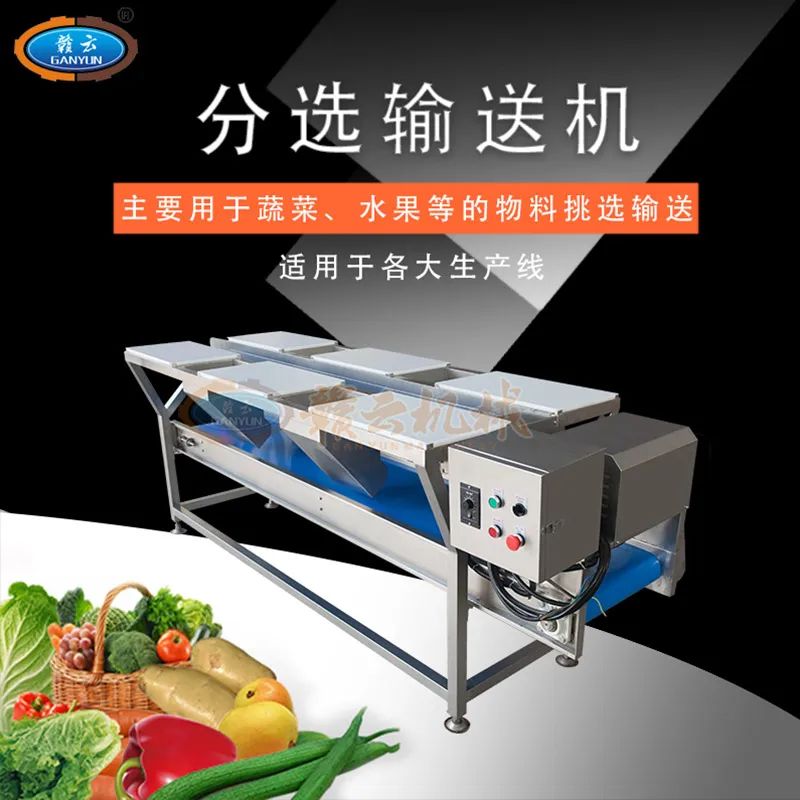 贛云牌FX-08型雙層挑選機,也叫分選機,模擬手工前期挑選工序設計二次,操作臺有上下分選輸送帶,上輸送帶將物料輸出至切菜機內進行切割工序,下輸送帶將廢料輸送至另一端收集出來。亦可根據客戶需求定制多層分選,定制加長加寬,以符合中央廚房加工需求之用。