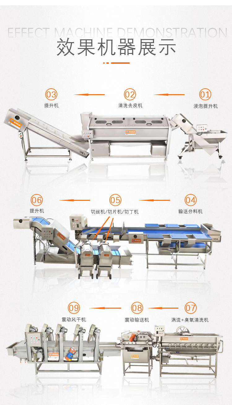 他集浸泡機(jī),清洗機(jī),提升機(jī),切割機(jī),風(fēng)干機(jī)等多種機(jī)器為一體,實(shí)現(xiàn)了瓜果從剛摘到可下鍋炒的全部過程,完美的節(jié)省了人力及時間,下面的圖片將詳細(xì)介紹這些設(shè)備。