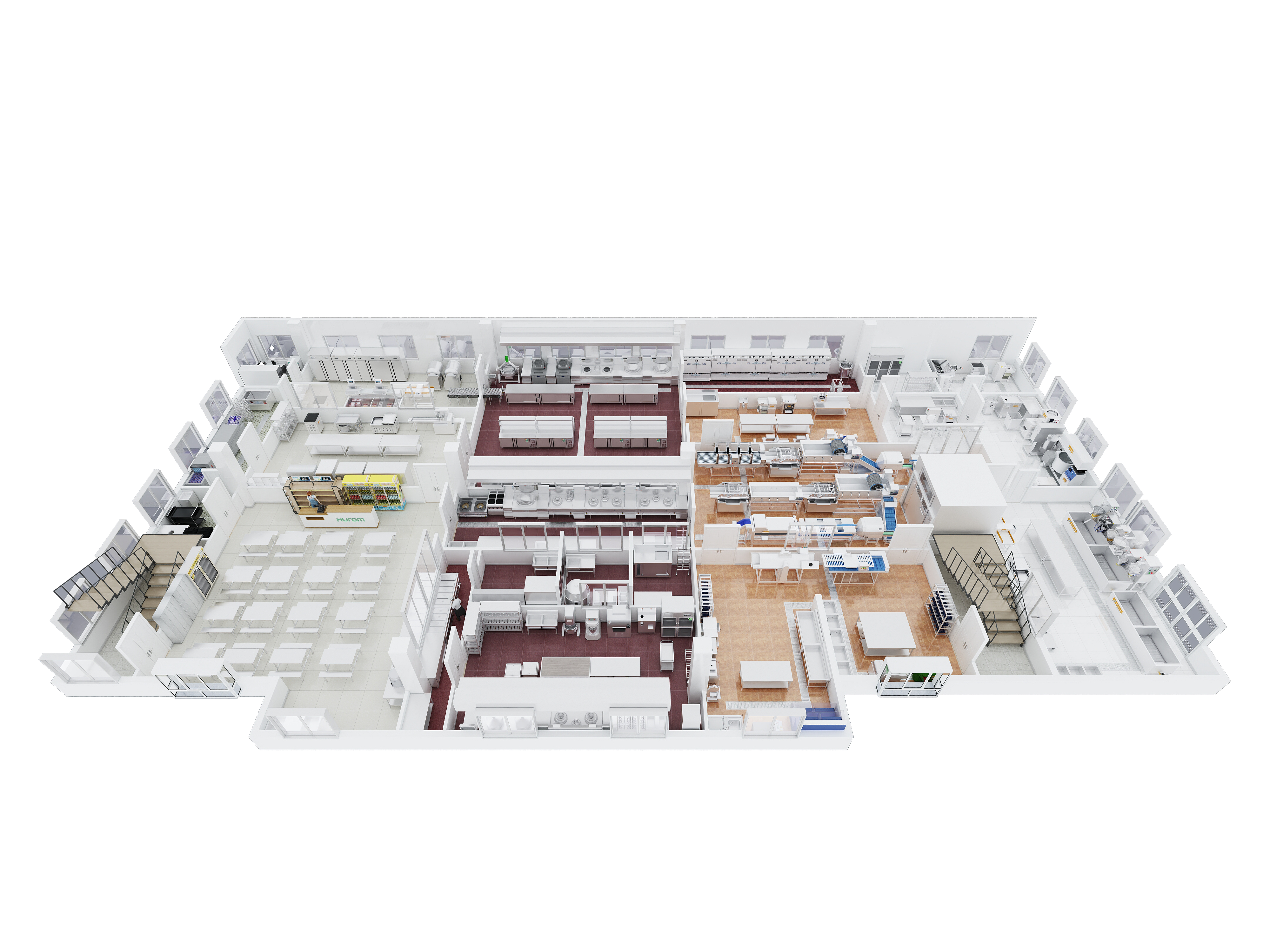 全自動一體機,實現從清洗、去皮、切配、稱量的自動化和規范化;烹飪區配備有各類智能炒菜鍋、自動炒菜機,