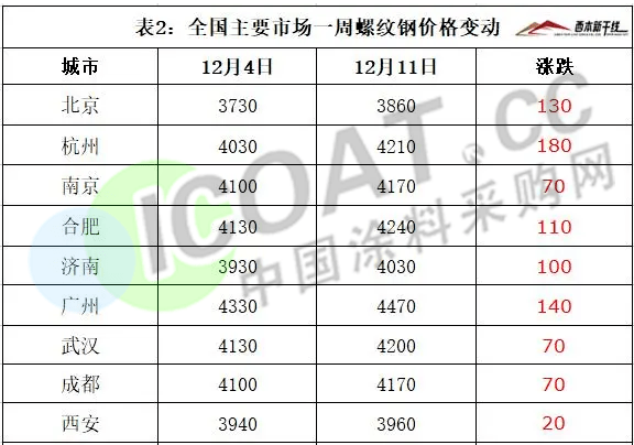 受黑色系期貨連續拉漲,以及原料價格整體走強等因素提振,國內建筑鋼材迎來一波強勁反彈。12月11日,北京地區調漲130元/噸,杭州調漲180元/噸,南京調漲70元/噸,合肥調漲110元/噸,濟南調漲100元/噸,廣州調漲140元/噸,武漢、成都、西安調漲70元/噸。