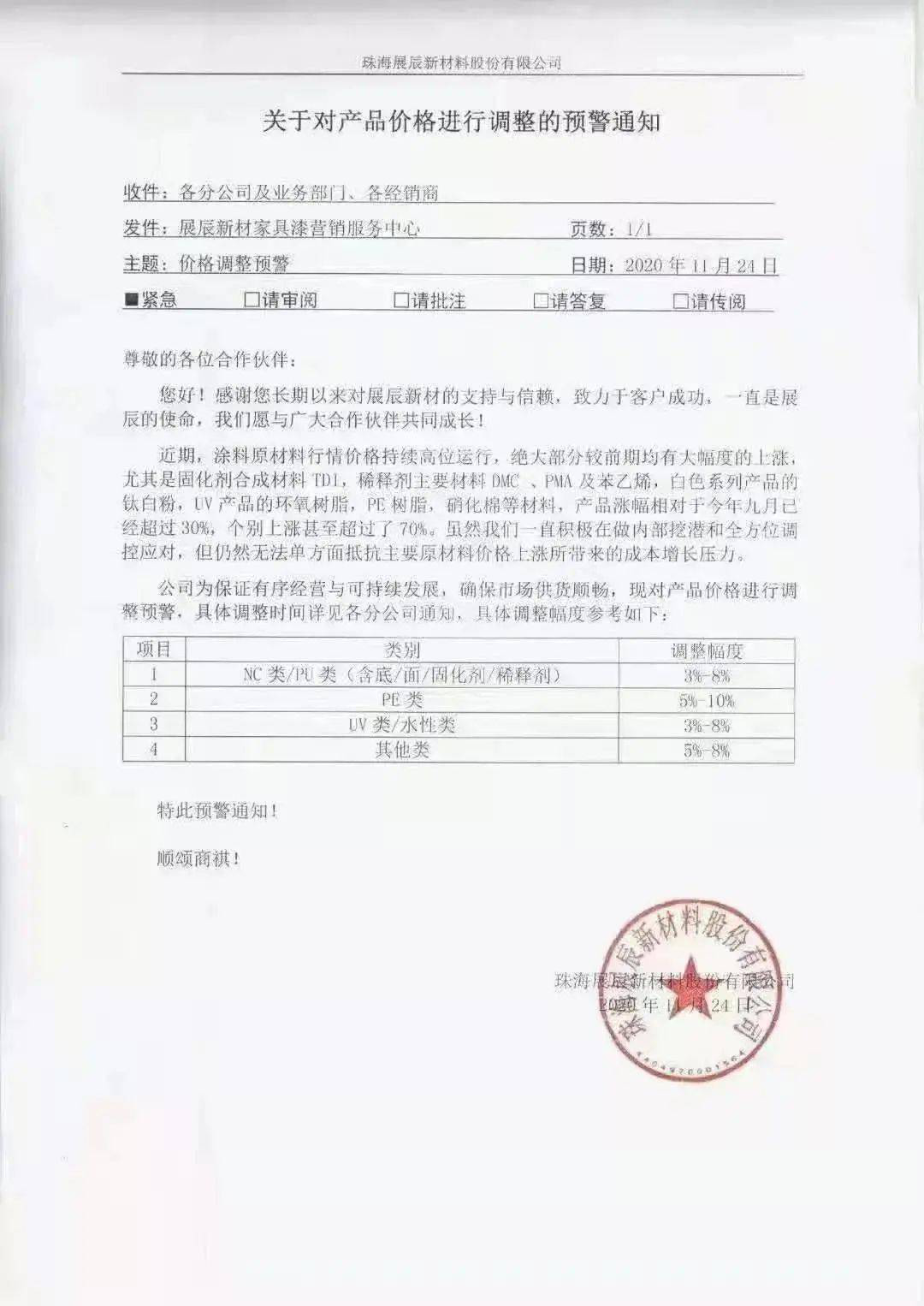 早在今年11月3日,以重防腐涂料為主營業務的無錫福斯特涂料有限公司則對外發布調價通知函,宣布:于2020年11月3日起在現售價基礎上:溶劑型涂料上調10%,水性涂料上調5%,其余系列產品全部上調5%。