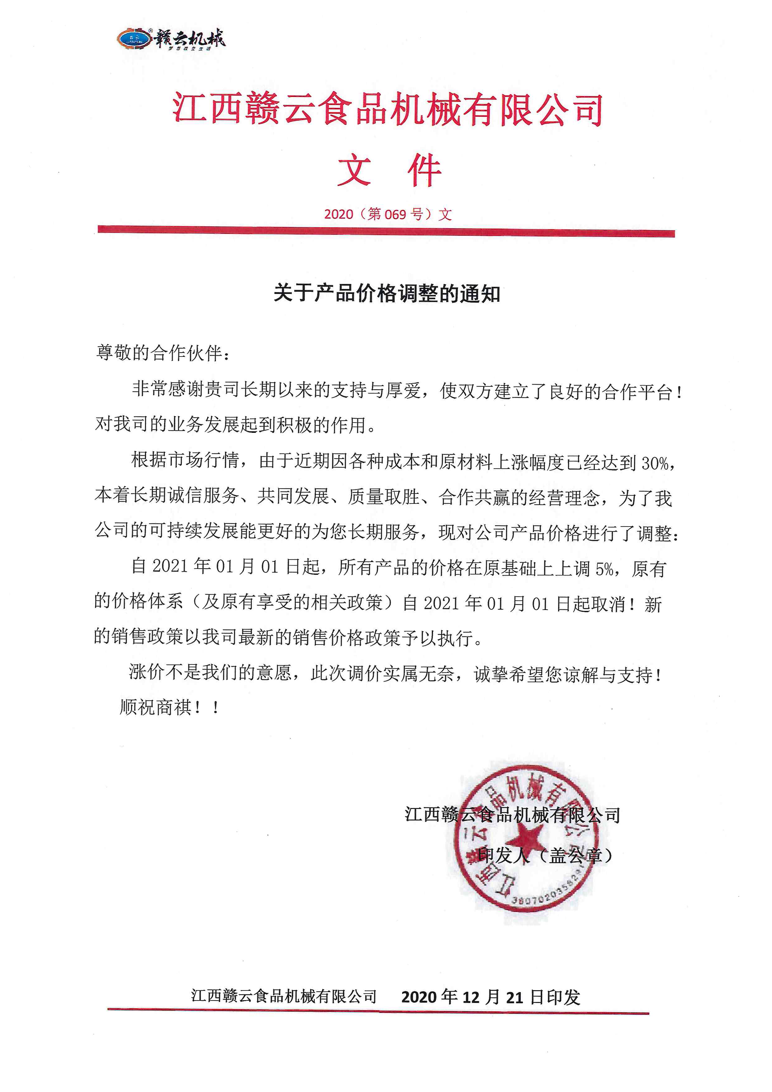 現對公司產品價格進行了調整。