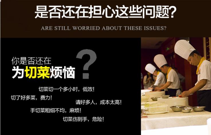 對于飯館,酒店,商業(yè)廚房等來說,切菜的數(shù)量龐大,使用人工不緊效率低,而且在長時(shí)間的切菜過程人,人的體力,注意力都會(huì)下降,導(dǎo)致容易受傷,而受傷不緊影響整體運(yùn)行,又耽誤工作,對于廚房工作者來說,都希望在短時(shí)間內(nèi)將工作做好,但速度快了又怕出錯(cuò)遭殃。