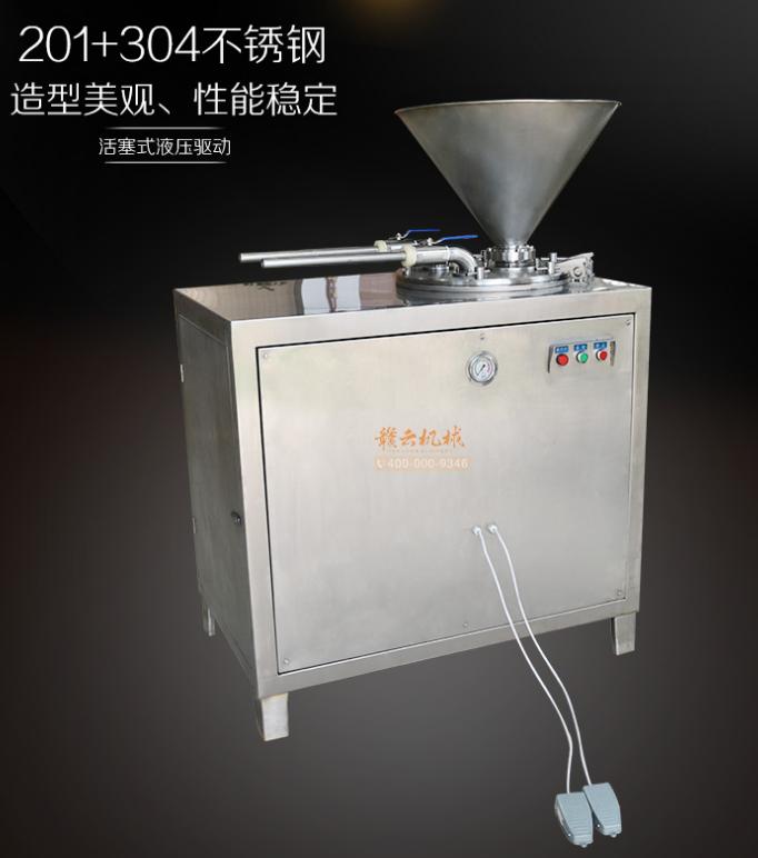 不銹鋼液壓灌腸機是一款可灌制不同腸類的機器,比較適用于:家鄉臘腸、火腿腸、肉泥腸、紅腸、廣式臘腸等不同類似和風味的香腸。機器采用不銹鋼材料、料斗、工作缸、液壓操作系統和電氣系統組成,主要工作原理是通過操縱轉閥控制活塞的往復運動,以完成吸料與擠料的運作,達到連續灌腸的目的,機器擁有兩個出料管,50L的大容量料桶,讓灌制香腸的效率更高。